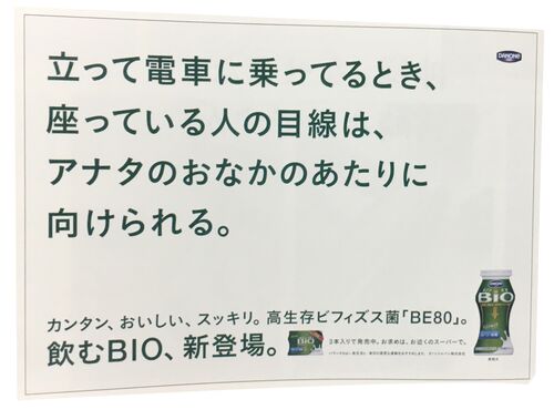立ってる電車に乗ってるとき、座っている人の目線は、アナタのおなかのあたりに向けられる。 (2011 【BIOドリンクタイプ】ダノンジャパン ●CW:葛西 洋介)----------------------------------------------------------------普段の日常を鋭く洞察したコピ…